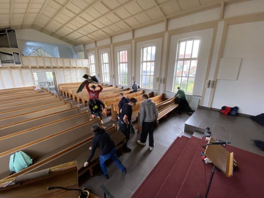 Die Johannis-Kirche in Gütersloh-Pavenstädt wird nur noch selten besucht und wird deshalb geschlossen. Die Sitzbänke aus der Kirche werden dort nicht mehr benötigt. Statt entsorgt zu werden, wird das Holz nun sinnvoll weiterverwendet: Die Bänke wurden der Schule im FiLB gespendet. Im Rahmen einer gemeinsamen Aktion haben einige Schülerinnen und Schüler zusammen mit Lehrkräften die Bänke aus der Kirche ausgebaut. Mit dabei waren Simon, Elex, Fabian, Justin, David, Emely, Leon und Mark sowie Herr Hoffmann und Herr Brokamp.